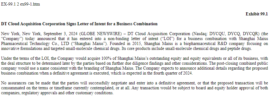 9月3日,SPAC公司DT Cloud Acquisition向美国SEC披露8-k文件,根据披露显示,公司与Shanghai Maius Pharmaceutical Technology Co., LTD上海贵之言医药科技有限公司签订了一份不具约束力的意向书,以进行业务合并。