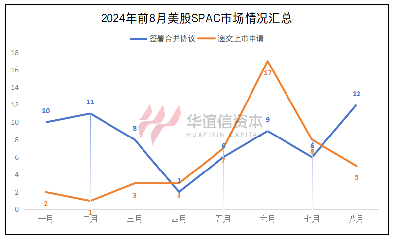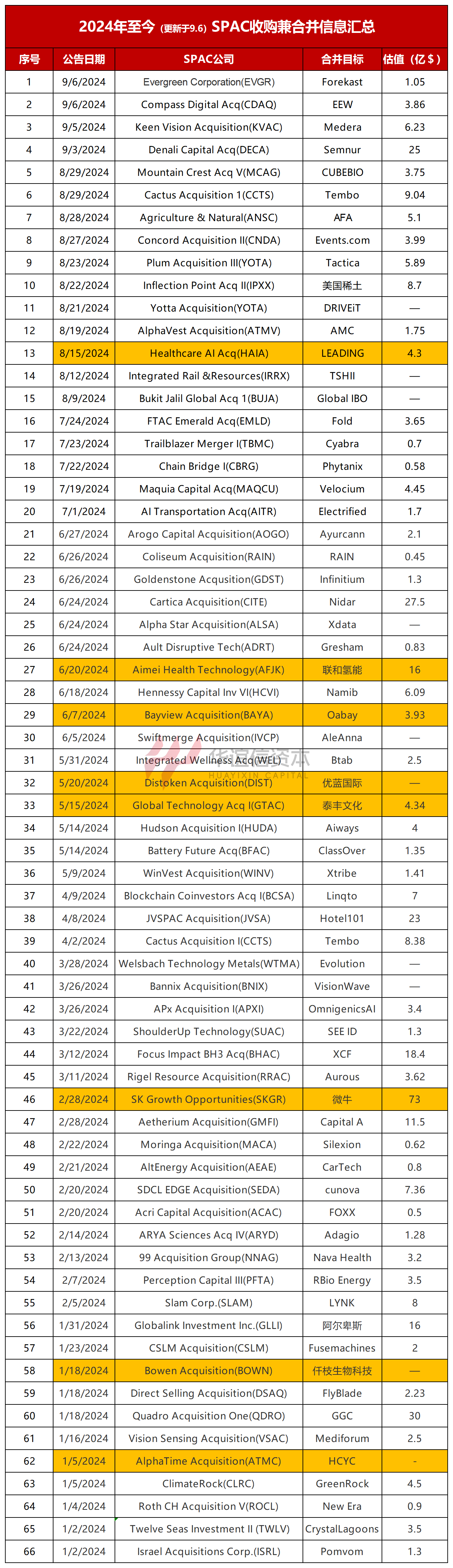 根据SPAC Insider披露的信息显示,2024年至今已有32家SPAC完成IPO上市,合计募集资金约58亿美元。其中,8月共有9家SPAC完成上市,募集资金约21.16亿美元;有7家企业完成合并;12家企业宣布签署合并协议;5家企业递交SPAC上市申请。中概股方面,8月无中概股企业完成SPAC上市。本文壳世界统计了今年8月的美股市场SPAC情况,并根据数据对美股SPAC未来趋势进行了预测,希望对大家有所帮助!