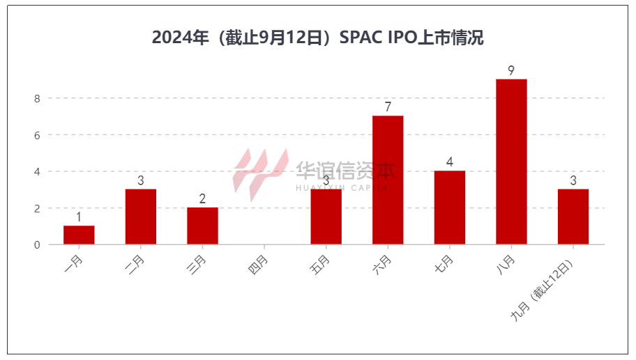 2024年8月,美股SPAC市场迎来了今年以来最活跃的一个月。本月共有9家SPAC完成了IPO,募集资金总额达到了21.16亿美元。上市数量不仅比7月份多了5家,而且募集的资金也增加了15.3亿美元。8月份的SPAC IPO活动无论在数量上还是资金规模上,都创下了2024年的新高。此外,9月份已有三家SPAC完成了IPO,募集资金约4.8亿美元。