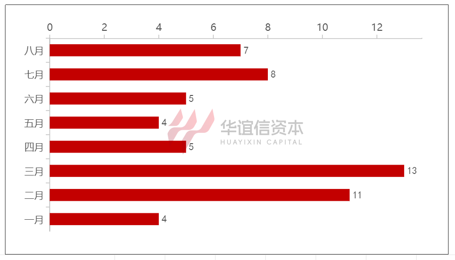 今年以来美股SPAC市场呈现活跃态势,平均每月有7家企业完成合并。8月美股SPAC市场持续活跃,本月共有7家企业成功完成合并交易。具体来看,并购周期最长达到32个月,涉及Rezolve AI公司;而最短仅需4个月,是肿瘤基因治疗公司Silexion的合并。(计算方法为从公开BCA到并购完成)。整体并购情况,平均并购时间为14个月。