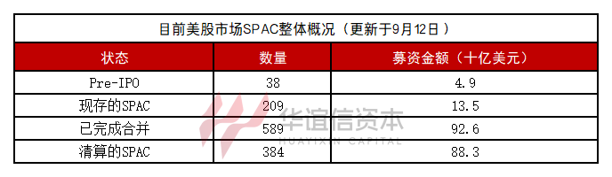 根据SPAC Research信息显示,截至2024年9月12日,美股SPAC市场呈现出活跃的态势。目前市场上共有209家SPAC,募集资金约140亿美元。38家企业已经完成了Pre-IPO阶段,募资金额达到约50亿美元。此外,已有589家企业完成合并,募集资金约为930亿美元。同时,市场上还有384家SPAC已经完成了清算。
