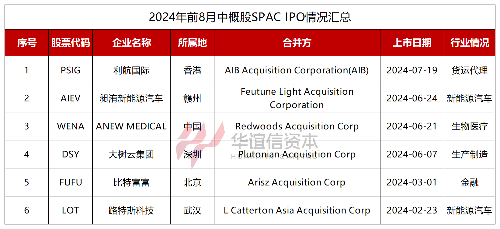 根据壳世界统计,2024年共有5家中概股企业通过SPAC实现上市,另1家中国人实际控股企业,分别是比特富富,路特斯科技,大树云,昶洧汽车、ANEW、利航国际。与去年同期相比减少了3家,8月份没有中概股企业上市。