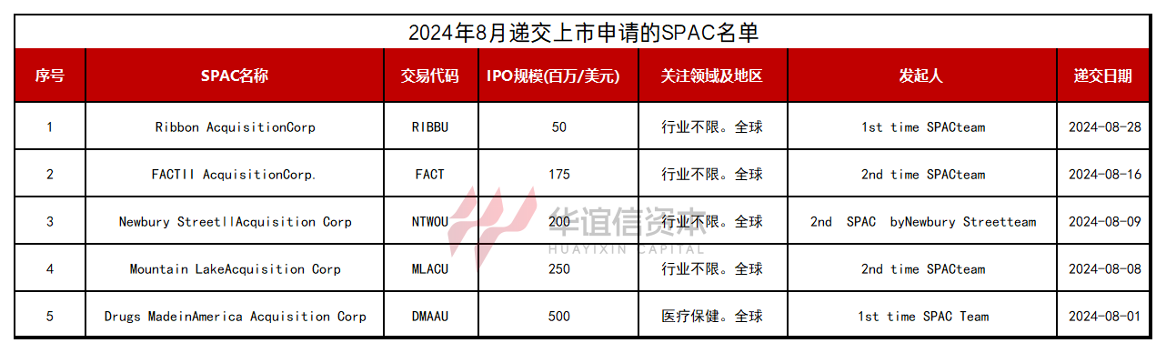 8月份有5家企业递交SPAC上市申请,具体名单如下: