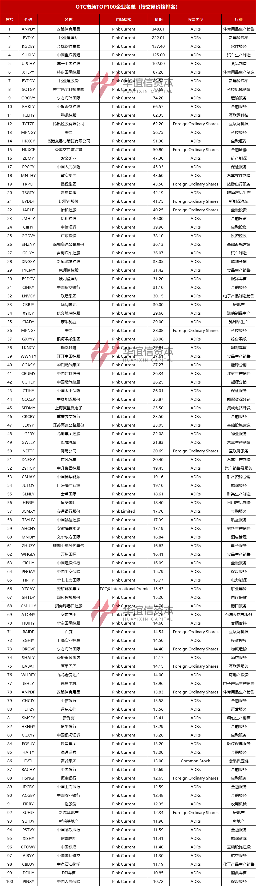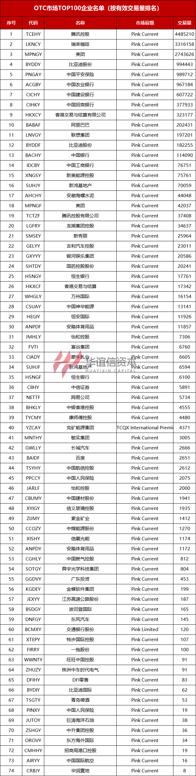 华谊信资本整理了OTC市场中截止至10月9日来自中国的企业排名前一百的名单,具体如下: