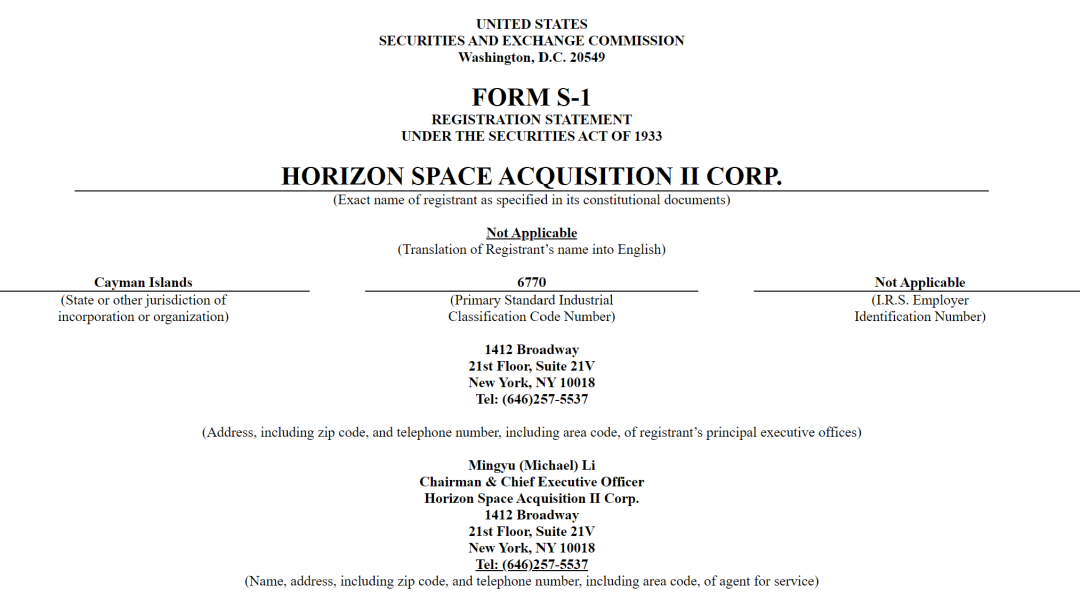 当地时间10月21日(北京时间10月22日),Horizon Space Acquisition II Corp (SPAC)公开向美国证券交易委员会(SEC)递交IPO,拟HSPTU为股票代码,申请纳斯达克上市。该公司最早于2024年8月12日向SEC递交秘密申请。
