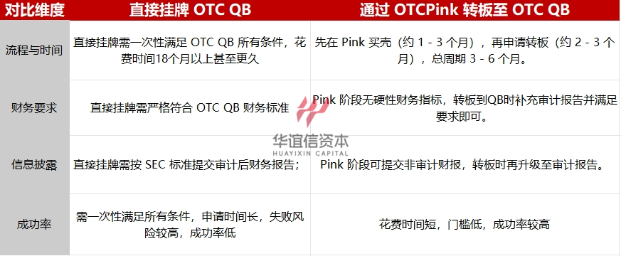 通过上面的对比和案例可以得出,对中国企业而言,直接挂牌OTC QB面临合规、财务、成本,时间长等多重挑战,而通过OTC Pink转板门槛更低,更贴合企业实际情况,是更具现实操作性的路径。