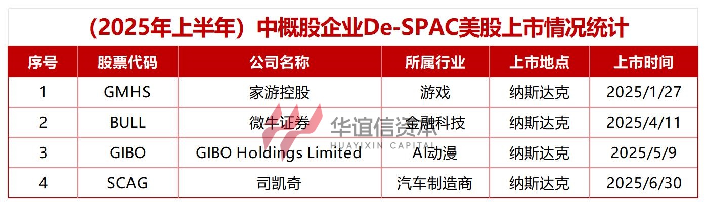 2024年,共有25家中国企业通过De-SPAC方式成功登陆美股市场。而2025年截至6月30日,已有4家中国企业采用De-SPAC方式在美国上市。