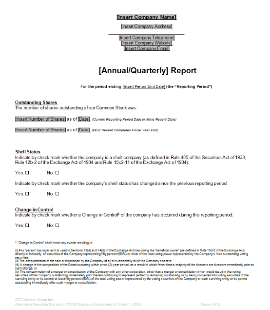 联邦和州证券法要求发行人向公开市场提供最新信息。为了便于遵守这些法律,OTC markets Group制定了OTCID公告指南,明确了在OTCID基础市场和粉单有限市场上市的公司需遵守的“替代报告标准”。对于不直接向美国证券交易委员会(通过EDGAR)、银行监管机构或非美国监管机构披露信息的公司,可以通过“替代报告标准”进行披露。依据这些指南及OTCID规则提供的信息,来确定公司是否符合进入OTCID市场或粉单有限市场的资格。