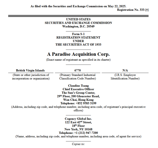 当地时间2025年7月30日,运营总部位于香港的SPAC:A Paradise Acquisition在纳斯达克交易所成功上市,其股票代码为“APADU”。公司于2023年1月17日向美国证券交易委员会(SEC)递交秘密招股书,并于2025年5月22日公开招股书。