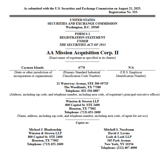 AA Mission Sponsor II是一家注册在开曼群岛的特殊目的收购公司(SPAC ),其目的是与一个或多个企业进行合并、股本交换、资产收购、股票购买、重组或类似业务合并。公司并购标的不限制区域和行业,聚焦食品饮料行业,估值要求 2 亿至 10 亿美元。初始并购期限 18 个月,可延长但不超过 36 个月,公司高管及董事均位于中国。