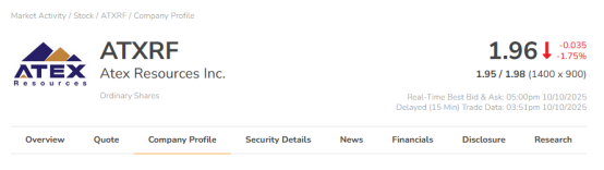1、Atex Resources Inc. (OTCQB: ATXRF)