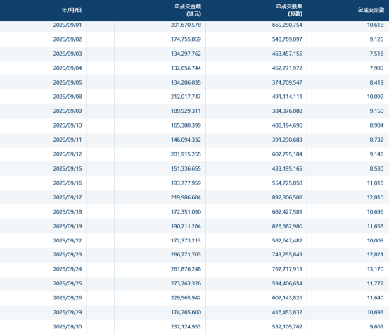 2025年9月香港创业板全月总成交金额约42.51亿港元,日度交易波动明显,虽部分交易日成交相对活跃,但整体规模与美国OTC市场单月4430亿元人民币(约5200亿港元)的交易额相比差距极大,反映出其在资本流动性和市场活力上的显著不足。