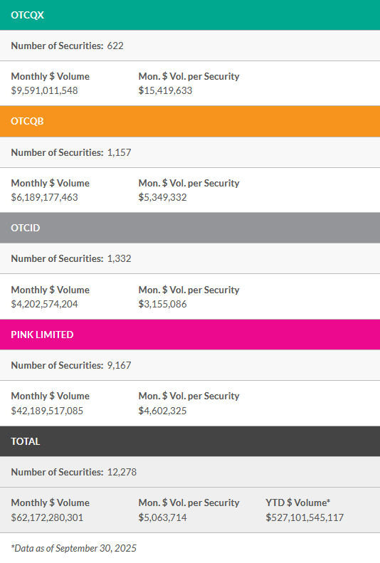 2025年9月美国OTC市场展现出分层多元、交易活跃、规模领先的特点:总计12278只证券,通过OTCQX(622只)、OTCQB(1157只)、OTCID(1332只)、Pink limited(9167只)的分层机制精准匹配不同阶段企业;9月总交易额达621.73亿美元,日均超28亿美元,单证券月均交易额506.37万美元且分层差异显著(如OTCQX单证券月交易额达1541.96万美元);其规模与活力远超同类场外及部分主板市场,是中小微企业对接全球资本的核心场外枢纽。