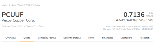 5、Pecoy Copper Corp. (TSX-V: PCU; OTCQB: PCUUF)