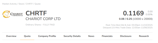 4、Chariot Corporation Ltd. (ASX: CC9; OTCQB: CHRTF)