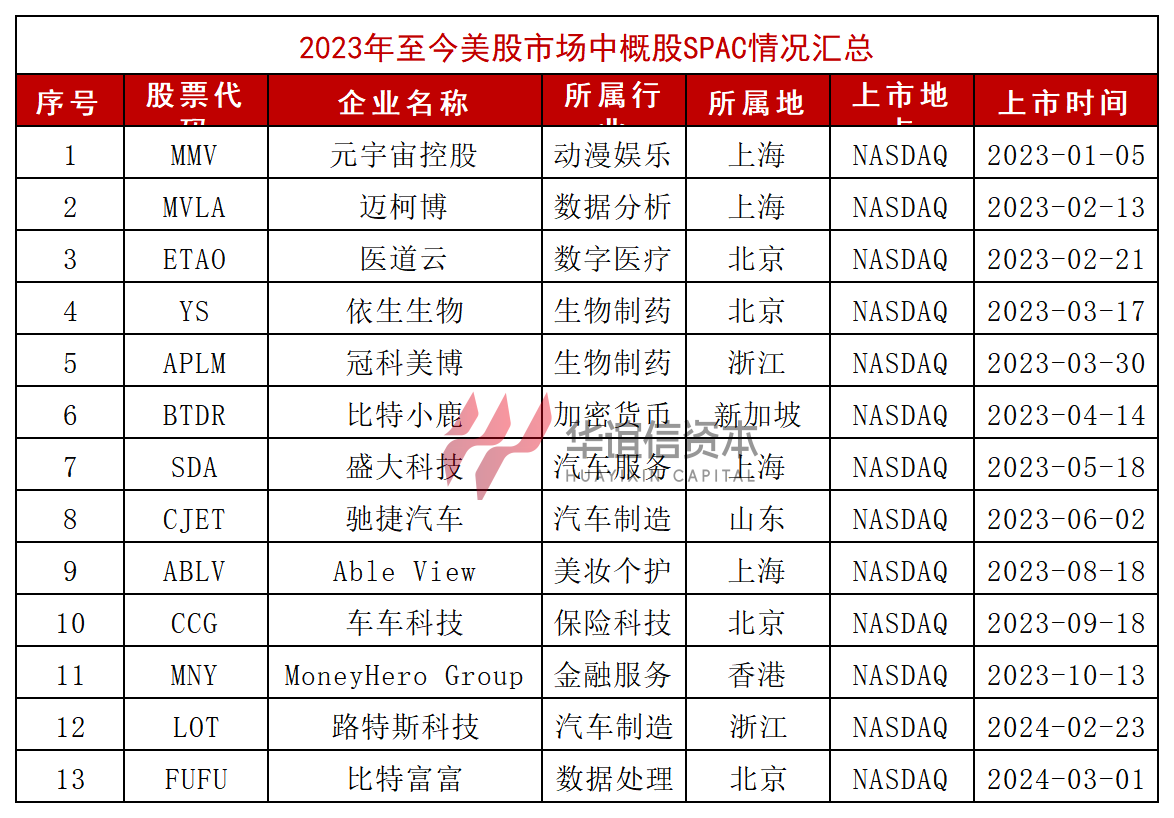 根据华谊信资本统计:去年至今共有13家中概股企业通过SPAC登陆美股市场。2023年,共有48家中企(含华人创立)登陆美股市场,其中有11家企业采用SPAC方式实现上市,占比高达23%,较2022年出现小幅增长,累计募资6.3亿美元,是自2022年SPAC热潮暂退后的又一次反弹。另外,今年有2家中概股企业成功SPAC上市,分别是路特斯科技和比特富富,合计募集资金约8.24亿美元。