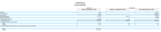 2024 年 4 月 24 日 - 12 月 31 日(剥离后运营时段):实现收入 465 美元,净亏损 86.2 万美元。
