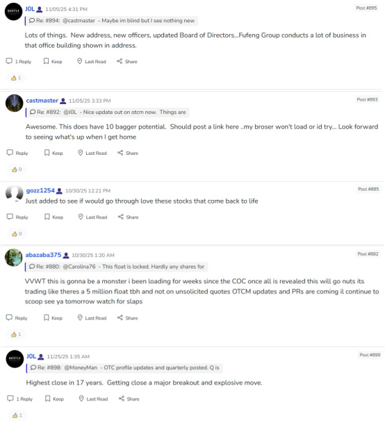 在外网投资者聚集平台,关于VVWT的讨论量呈几何级增长,投资者围绕这家企业的近期动态展开热烈讨论。大量散户投资者发表看好言论,形成强烈的市场看多情绪。市场情绪被点燃,买盘涌入,股价随即开始走高。