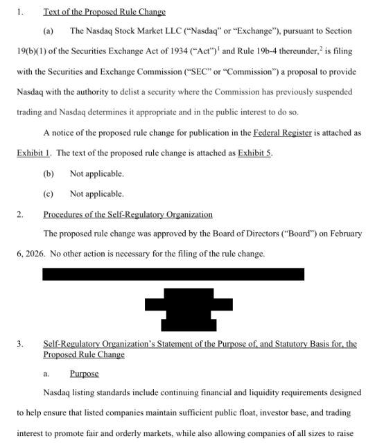 2026年2月20日,纳斯达克向美国SEC提交编号为SR‑NASDAQ‑2026‑009的规则变更提案,拟新增上市规则IM-5101-4,大幅扩展退市监管权限,打破原有仅能因公司自身违反上市标准方可退市的限制。