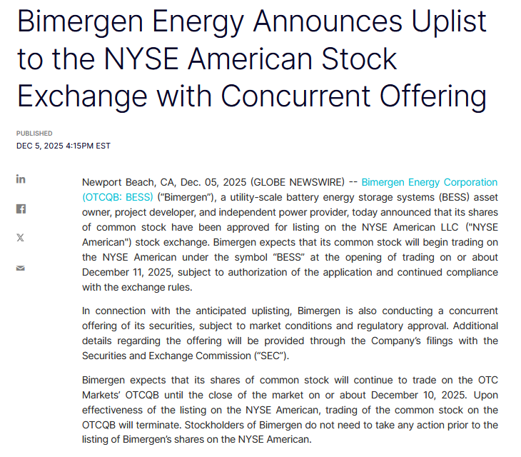 BimergenEnergy(BESS):这是一家无营收企业,但也是从OTC市场成功转板至美国主板交易所的典型案例。主要核心业务为美国的关键电网区域将迎来23个电池储能系统(BESS)和13个太阳能项目的部署,这些项目总计将达到1.965吉瓦的储能容量。