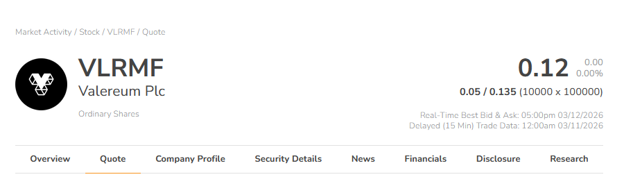 10、Valereum Plc (AQSE:VLRM;OTCQB:VLRMF)