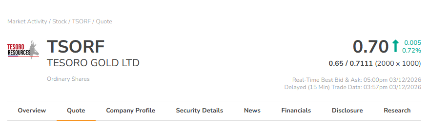 7、TESORO GOLD LTD (ASX:TSO;OTCQB:TSORF)