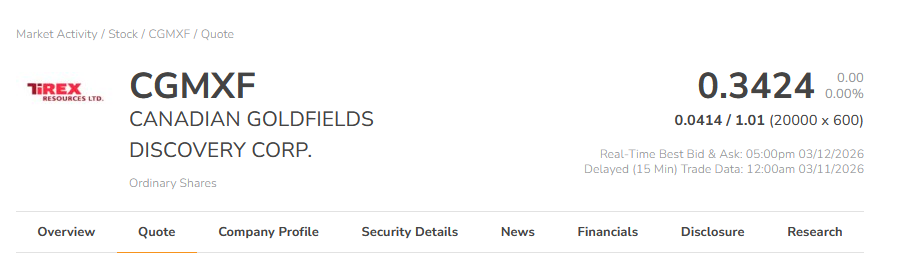 2、CANADIAN GOLDFIELDS DISCOVERY CORP. (TSX-V:CGM;OTCQB:CGMXF)