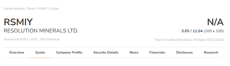 6、RESOLUTION MINERALS LTD. (ASX:RML;OTCQB:RLMLF,RSMIY)