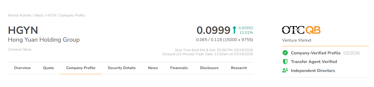 洪元控股(OTCQB:HGYN)是近期OTC升板模式的标杆案例,其阶梯式赴美上市路径极具参考价值: