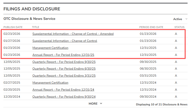 2月中旬即完成管理层及官网的信息变更,助力客户实现在OTC官网上公司核心管理人员的信息变更及相关合规文件披露、取得OTC上市主体绝对控制权,成功登陆美国OTC市场。