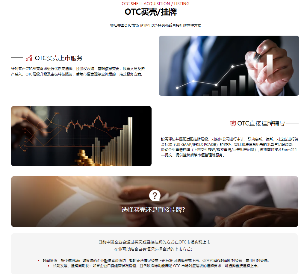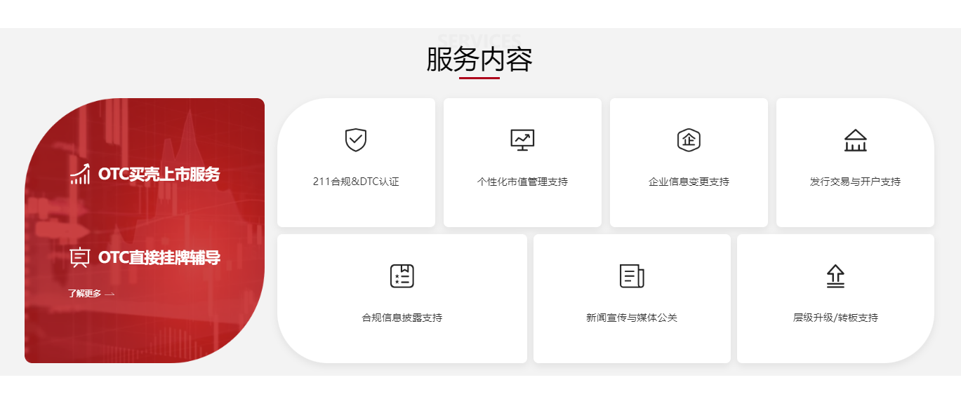 本次2.0版本新增的核心板块——OTC服务项目与服务内容,进一步完善了平台服务体系,清晰呈现OTC买壳与OTC挂牌的区别与双重选择,让企业清晰匹配自身需求。