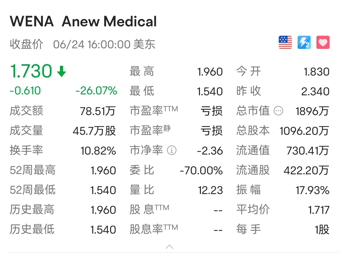 ANEW MEDICAL, INC.(PINK:LEAS)与SPAC:Redwoods Acquisition成功完成合并,合并后估值达到9700万美金,比最初公布的9400万美金高出300万美金。目前该交易已经完成,合并后的公司于2024年6月24日,成功在纳斯达克上市,股票代码为WENA。