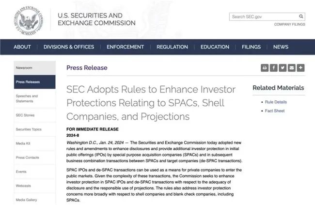 2024年1月24日美国证券交易委员会(SEC)通过了有关特殊目的公司(SPAC)的最终监管规则(即SPAC新规),涵盖了SPAC、IPO与业务合并(DE-SPAC)等诸多方面,华谊信就该次新规做出以下简要解读。
