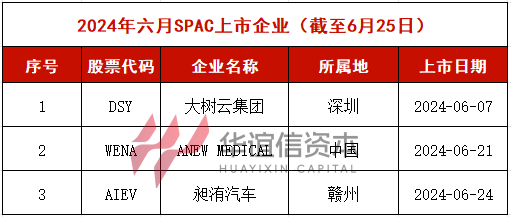 根据华谊信统计,2024年6月SPAC上市中企共有3家,具体名单如下表:
