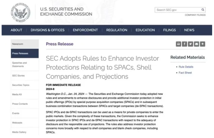 SEC于2020年及2021年期间数度出台意见指引,并随后于2022年3月颁布了加强SPAC监管的草案(“监管草案”)。此次的SPAC新规正是在监管草案基础上历经近两年征求市场意见后拟定,旨在为SPAC IPO及de-SPAC交易提供更全面的披露,并为投资者提供更有力的、与传统IPO趋于一致的保护。SPAC监管新规将于在《联邦公报》发布125天后生效。