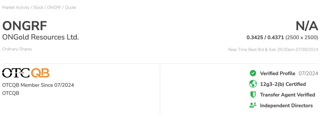 2、ONGold Resources Ltd. (股票代码: ONGRF)