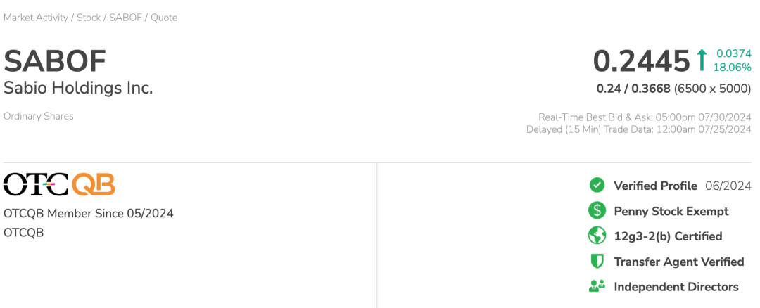 4、Sabio Holdings Inc. (股票代码: SABOF)
