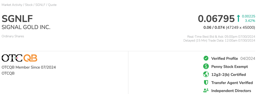 5、SIGNAL GOLD INC. (股票代码: SGNLF)