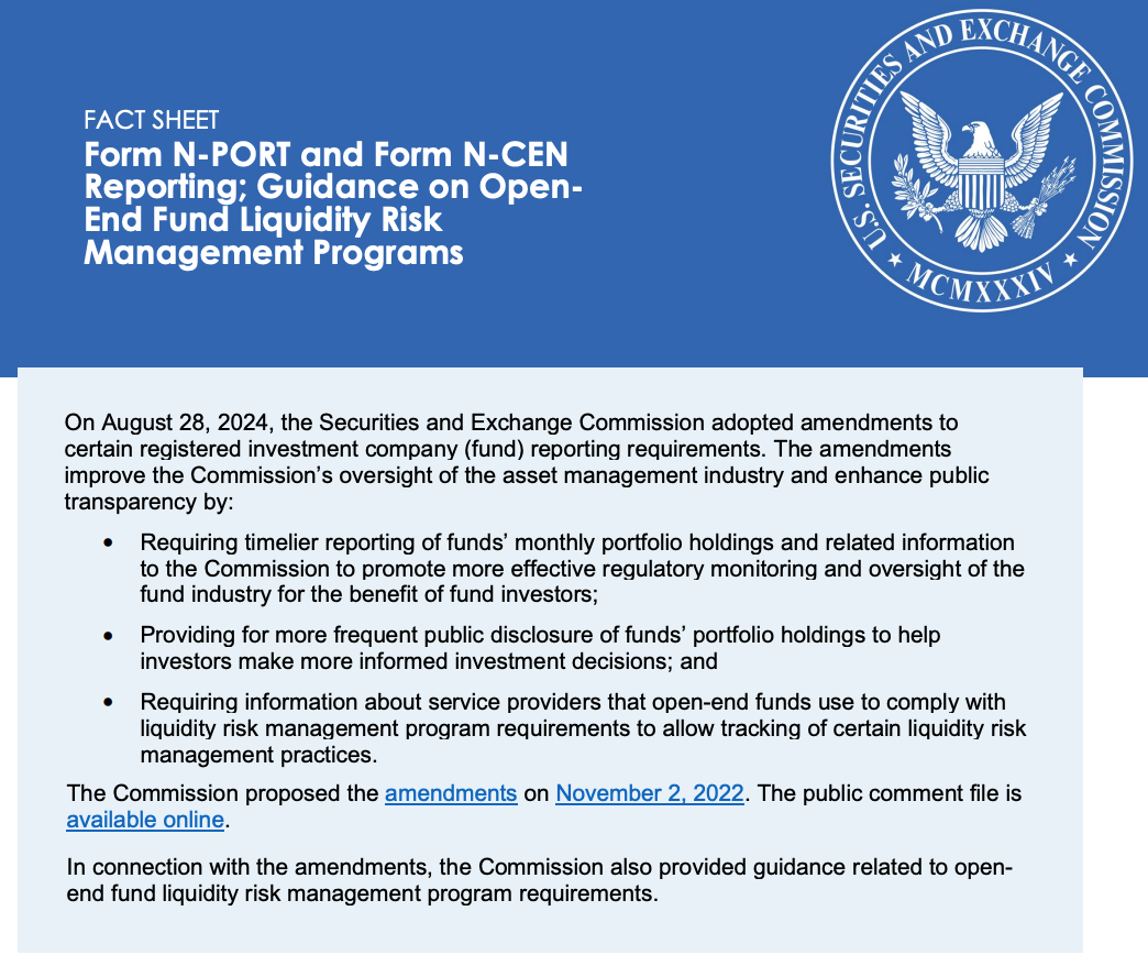 美国证券交易委员会于2024年8月28日通过了 N-PORT 表格报告要求的修订,以便为委员会和投资者提供有关某些注册投资公司(基金)的更及时的信息。